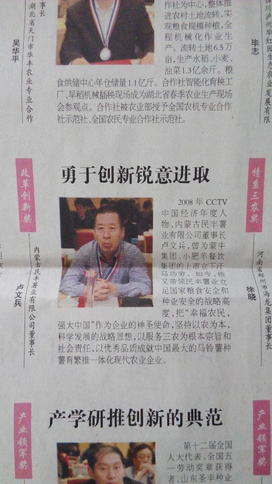 日前,全國“北大荒”杯2013年度“中國農(nóng)村新聞人物”評選活動揭曉,內(nèi)蒙古民豐薯業(yè)有限公司董事長盧文兵光榮當(dāng)選,獲“改革創(chuàng)新獎”。
